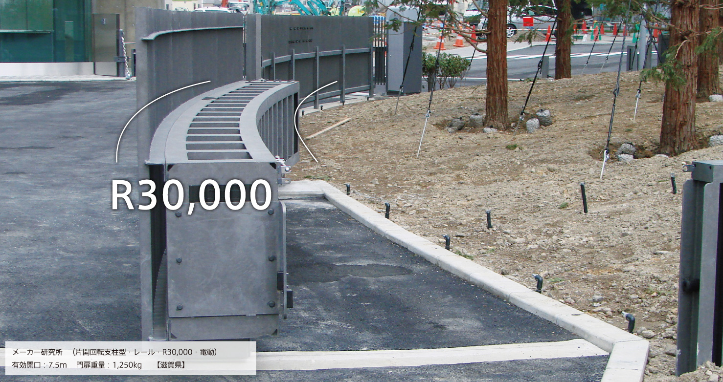 門扉本体とレールにカーブをかけて製作します。敷地条件に合わせてカーブにすることで問題を解決できる場合やその造形美にこだわりたい場合などに対応できます。引門扉、開門扉の両方で製作可能です。