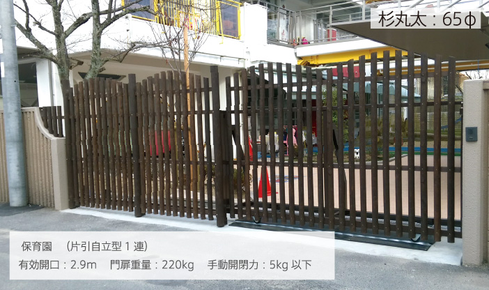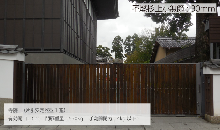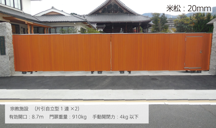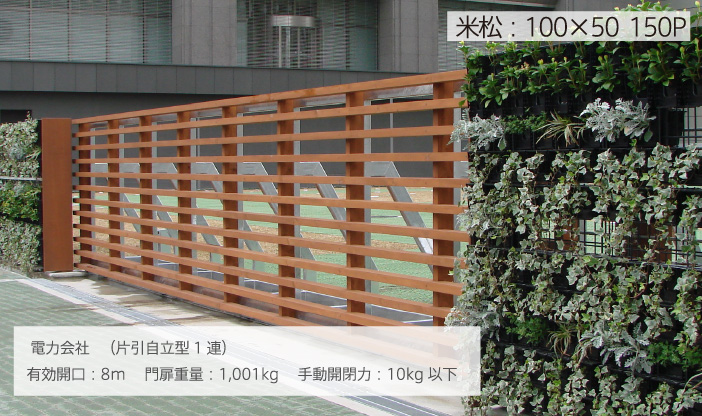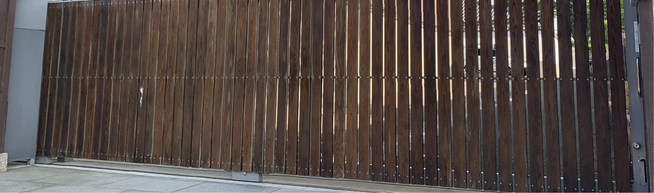 門扉の外観に木製素材を活かしたいという依頼は最近特に増えています。建物、施設外観とデザインを統一させた雰囲気が必要な場合など、多くのニーズに対応しています。門扉の軸組構造は鋼製ですが、意匠として木を利用することで、より趣ある雰囲気が表現できます。木材の種類も多数あり、不燃・耐火処理など特殊加工も可能です。