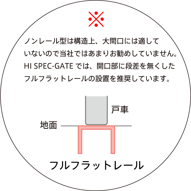 開口部にレールが敷かれ、その上を戸車がスライドするのが理想的な引門扉の構造です。ただし、勾配・傾斜・積雪など敷地の諸条件でレールを設置できない場合は、地面環境に左右されないこのノンレール構造で対応します。