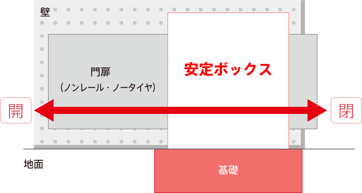 開閉時、垂直状態での走行を維持するための“安定ボックス”を有し、門扉を空中走行させる構造。